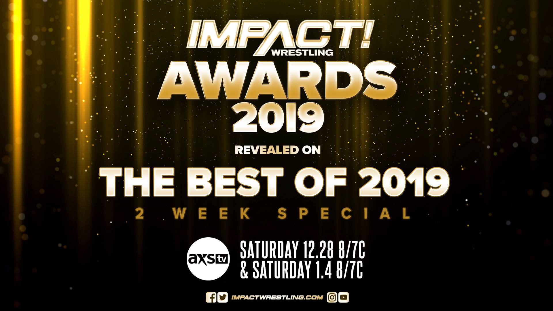 The next two episodes of IMPACT! will have special air dates of Saturday, December 28th and Saturday, January 4th. The Dec 28 episode will air at 9/8c on AXS TV and 8/7c on Twitch, while the Jan 04 episode will simulcast on both AXS TV and Twitch at 9/8c. To commemorate the year that was, we will take a look back at the greatest moments of 2019, plus reveal the winners of the 2019 Year End Awards.