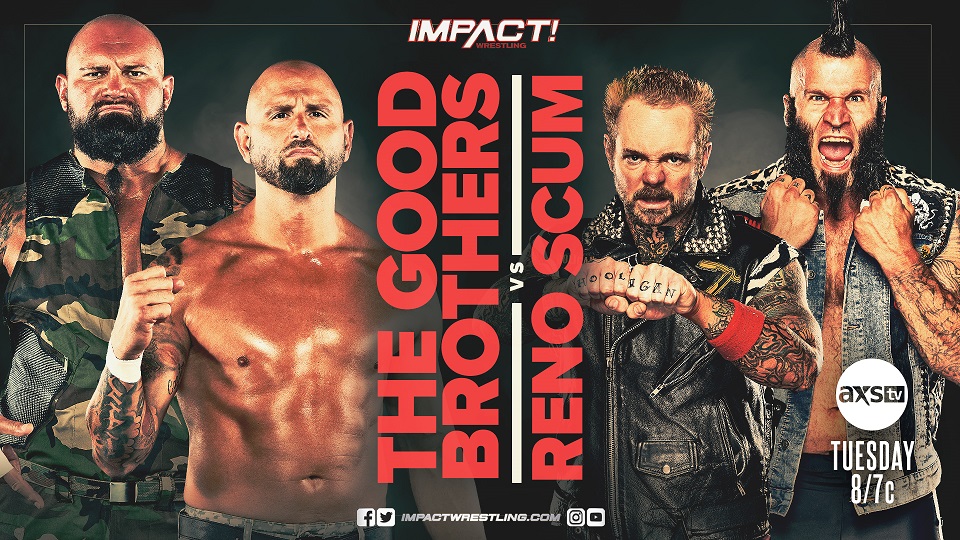 The Good Brothers have arrived in IMPACT Wrestling and they’re not backing down from anyone. Last week, Doc Gallows and Karl Anderson were confronted by Ace Austin and Madman Fulton in the parking lot but that was only a distraction so that Reno Scum could attack them from behind. As Gallows and Anderson fought them off, Ace and Fulton sped away in their vehicle. Now, IMPACT fans around the world will get to witness The Good Brothers in action as make their in-ring debut against Reno Scum this Tuesday on AXS TV.