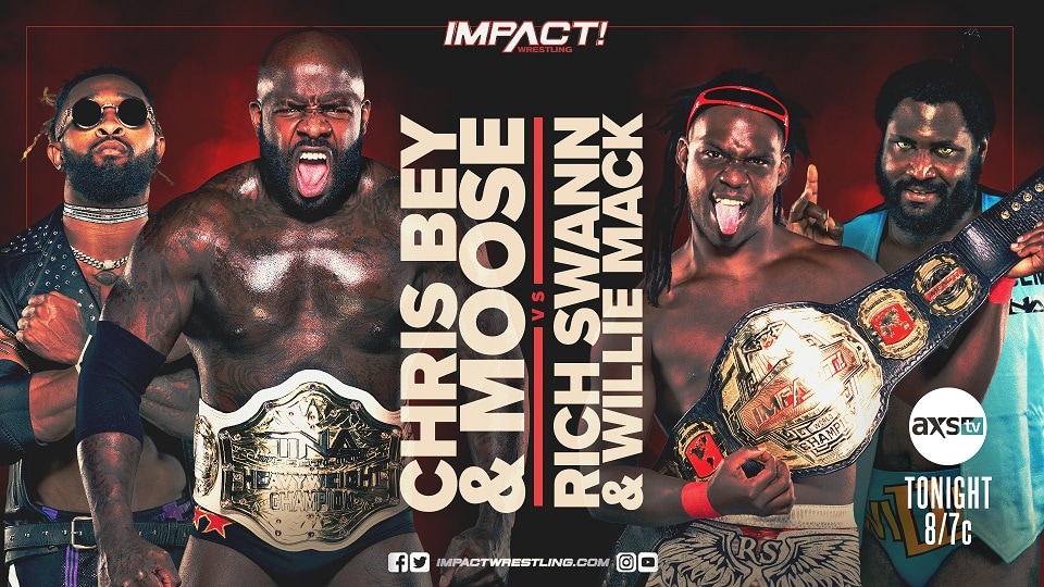 Just days before Rich Swann defends the IMPACT World Title against Chris Bey at Final Resolution, the two will meet in a huge tag team main event. There’s no telling what may happen when these four combustible elements step into the ring on AXS TV. Moose has his sights set on the reigning champ. Willie Mack is out for revenge. Chris Bey is looking to make a statement before arguably the most important match of his career. And Rich Swann is hoping to stand his ground at the top of the mountain. Don’t blink tonight on IMPACT!