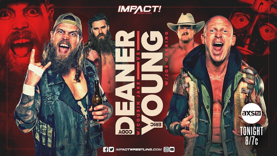 Eric Young and Joe Doering have been sending cryptic messages in the form of violent attacks on unsuspecting members of the IMPACT Wrestling roster, repeatedly stating that this world belongs to them. Last week, they targeted The Deaners and it has led to a singles match between Cody Deaner and Eric Young tonight on IMPACT! In an emotional reveal, Cody spoke about growing up in the wrestling industry alongside Young – but now, Young looks at him as a joke. Does Cody have what it takes to change Young’s impression of him? Don’t miss what is sure to be a hard-hitting collision on AXS TV.