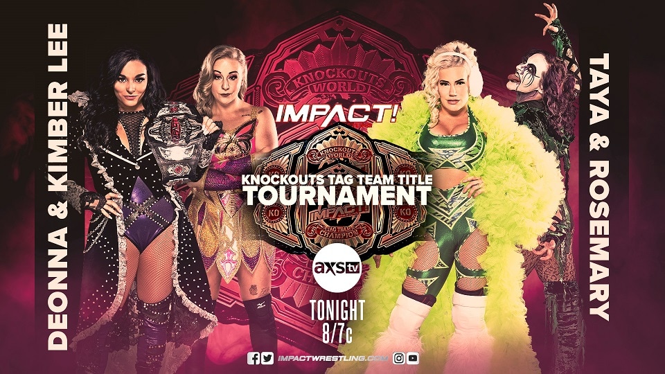 The final match in the first round of the Knockouts Tag Team Title Tournament will take place tonight on IMPACT! Knockouts Champion Deonna Purrazzo teams with her sidekick Kimber Lee to battle Knockouts veterans Taya Valkyrie and Rosemary. After Su Yung was carried out of the IMPACT! Zone at the hands of Father James Mitchell last week, The Virtuosa should be able to shift her focus towards gaining more gold in the tournament.