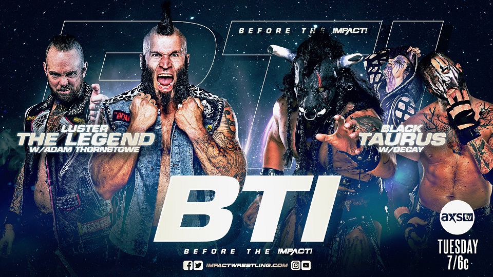 One hour before IMPACT! goes on the air, don’t miss BTI at 7/6c on AXS TV. This week’s exclusive match will pit Reno Scum‘s Luster The Legend against Decay‘s Black Taurus. What will happen just days after Decay defeated Reno Scum in tag team action at Sacrifice? As always, BTI will also feature in-depth previews, exclusive interviews, behind-the-scenes access and more.