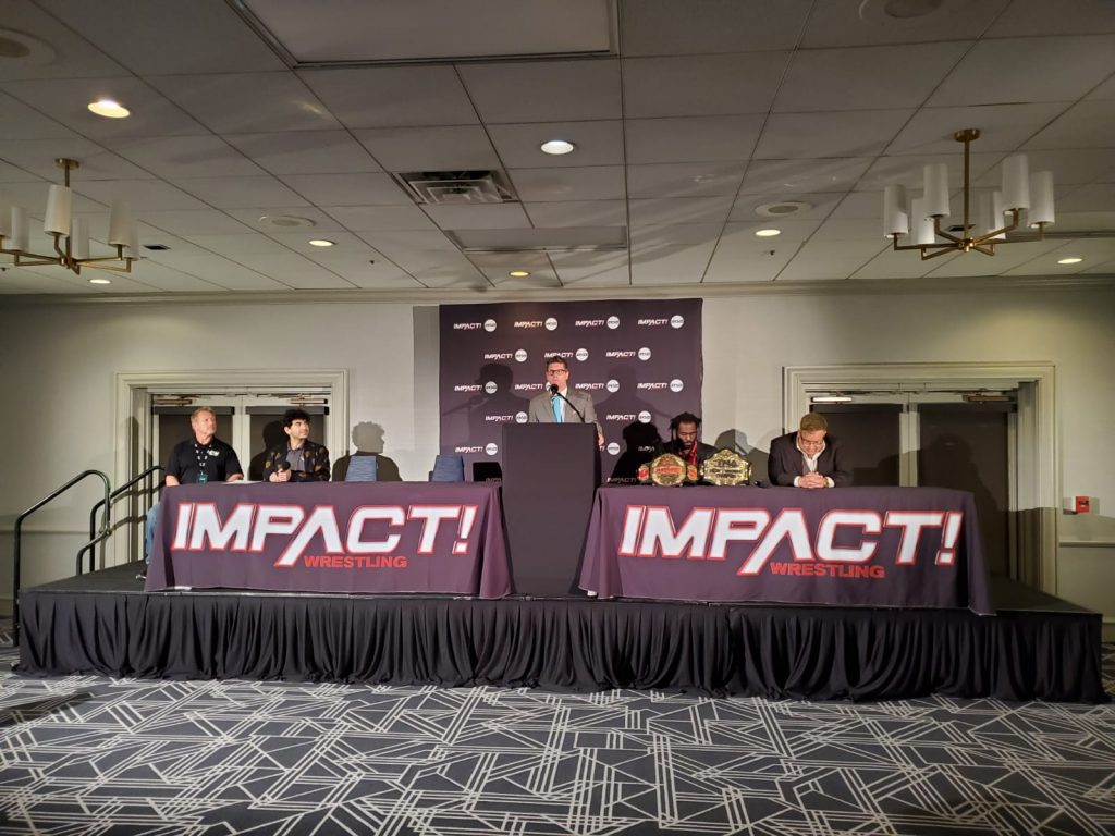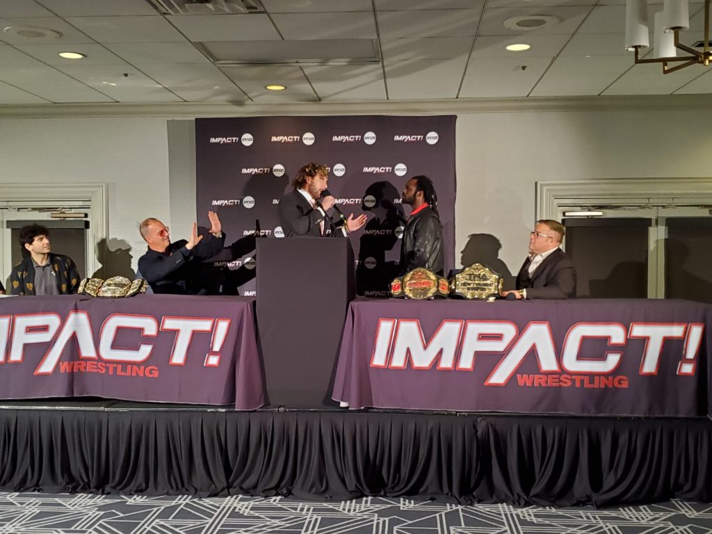 The conference kicked off with IMPACT World Champion Rich Swann, IMPACT Executive Vice President Scott D’Amore, AEW President Tony Khan and IMPACT Official Jerry Lynn in attendance. Conspicuous by their absence were AEW World Champion Kenny Omega and his manager, IMPACT Executive Vice President Don Callis.