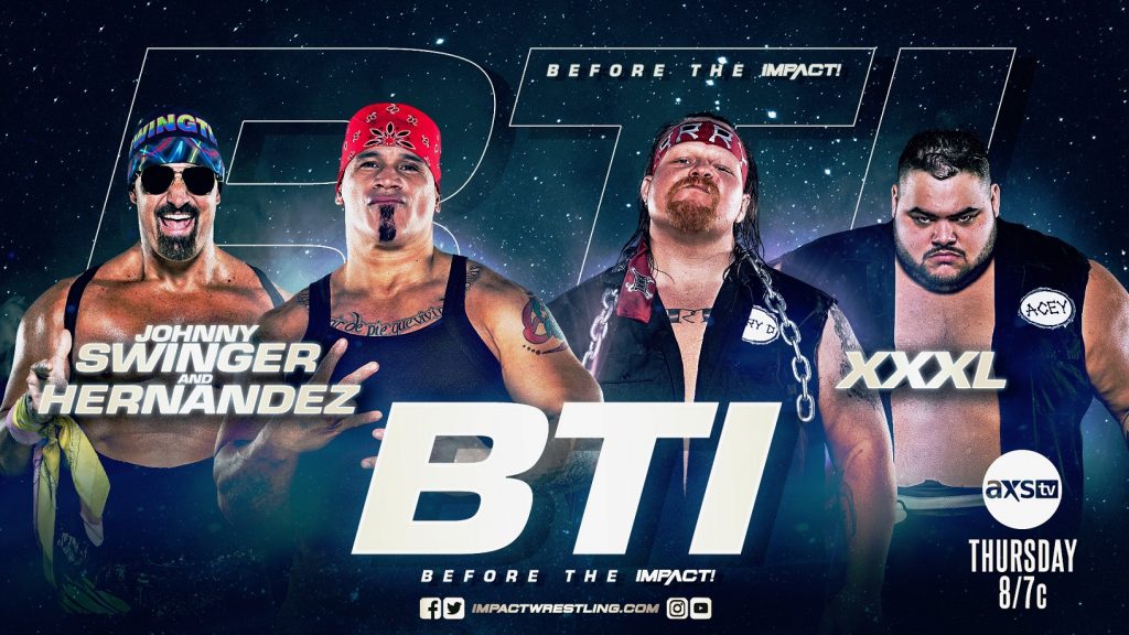 The action begins on BTI, just one hour before IMPACT! goes on the air. Tune in to AXS TV at 7/6c as Jon Burton, Gia Miller and Josh Mathews get you ready for the night ahead, featuring in-depth previews, exclusive interviews, behind-the-scenes access and an exclusive match! After they were kicked out of Swinger’s Palace at Under Siege, XXXL take on Johnny Swinger and his muscle, Hernandez!