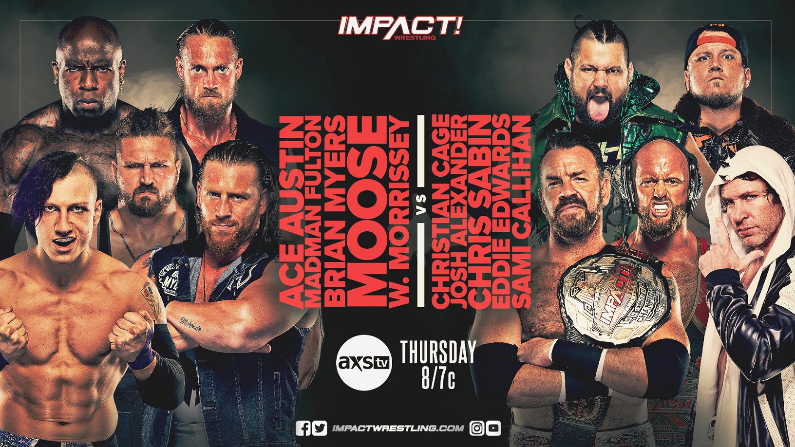 Just two nights before Christian Cage defends the IMPACT World Title against Ace Austin, both champion and challenger will lead their hand-picked teams into a colossal 10-man war! Buckle up as IMPACT World Champion Christian Cage, X-Division Champion Josh Alexander, Chris Sabin, Eddie Edwards and Sami Callihan take on Ace Austin, Madman Fulton, Brian Myers, Moose and W. Morrissey! Who will gain momentum heading into Victory Road?