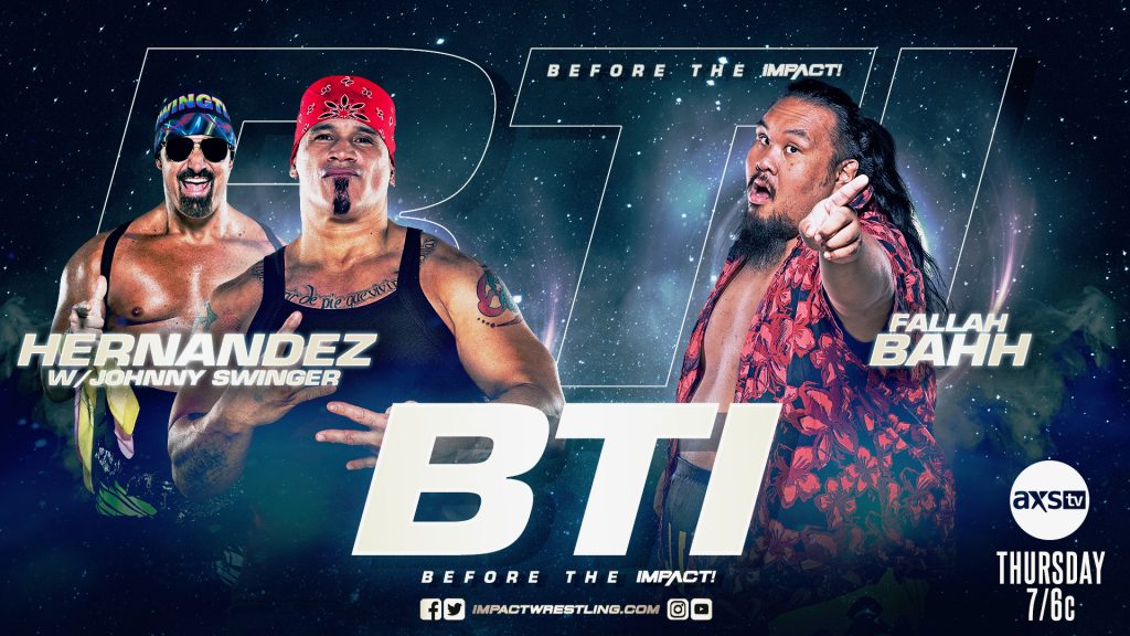 The action begins on Before the IMPACT, this Thursday at 7/6c on AXS TV. Following the closure of Swinger’s Palace, Hernandez turns his focus to in-ring competition when he takes on Fallah Bahh! Plus, Jon Burton, Gia Miller, Josh Mathews and George Iceman get you ready for all things IMPACT.