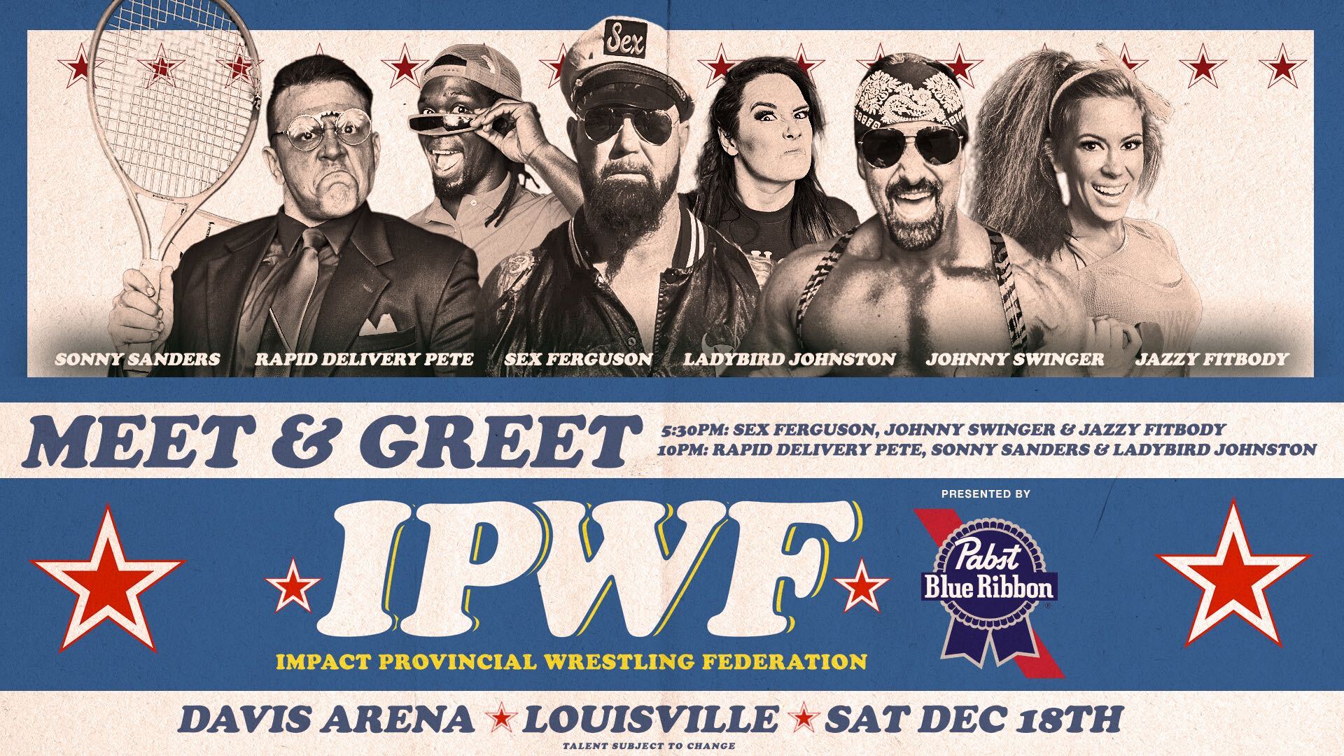 For one night only, you have the opportunity to meet the stars of the IMPACT Provincial Wrestling Federation during a series of special Meet & Greets before and after Throwback Throwdown II! Don’t miss Sonny Sanders, Rapid Delivery Pete, Sex Ferguson, Ladybird Johnston, Jazzy Fitbody and of course, Johnny Swinger.