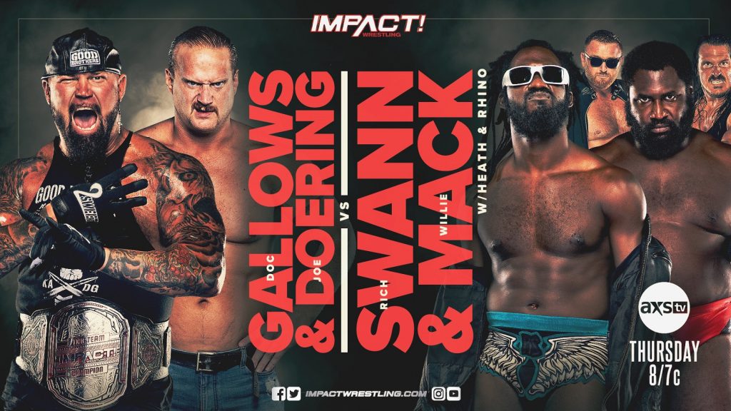 Violent By Design always has a plan. When the group got involved in the Street Fight between Eric Young and Rhino last week, it was Heath, Rich Swann and Willie Mack who evened the odds. After Young capitalized on the chaos to defeat Rhino, Violent By Design formed an unholy alliance with IMPACT World Tag Team Champions The Good Brothers to lay out their competition! This Thursday, what will happen when Rich Swann and Willie Mack battle the colossal pairing of Doc Gallows and Joe Doering in a must-see tag team bout?