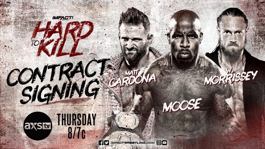 Before they collide in a Triple Threat World Title showdown on January 8th at Hard To Kill, IMPACT World Champion Moose, Matt Cardona and W. Morrissey will sign the contract for the blockbuster matchup this Thursday. After W. Morrissey was disqualified in last week’s IMPACT! main event against Matt Cardona, the situation quickly escalated into an all-out brawl that saw Cardona stand tall over his Hard To Kill opponents. Now there’s no telling what might happen when Moose, Cardona and Morrissey come together once again to sign on the dotted line!