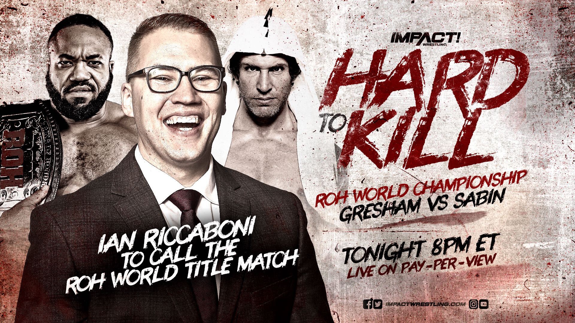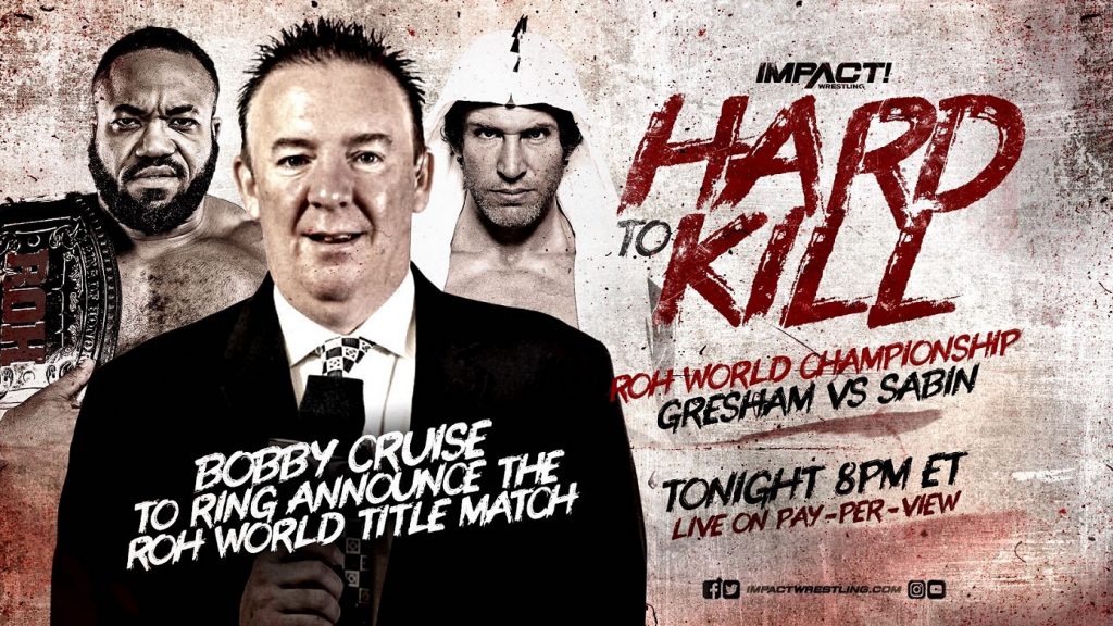 In another batch of huge news regarding tonight’s Hard To Kill pay-per-view event, Ian Riccaboni will call the ROH World Title match between reigning champion Jonathan Gresham and Chris Sabin, while Bobby Cruise ring announces this historic first-ever ROH World Title defense on an IMPACT event!