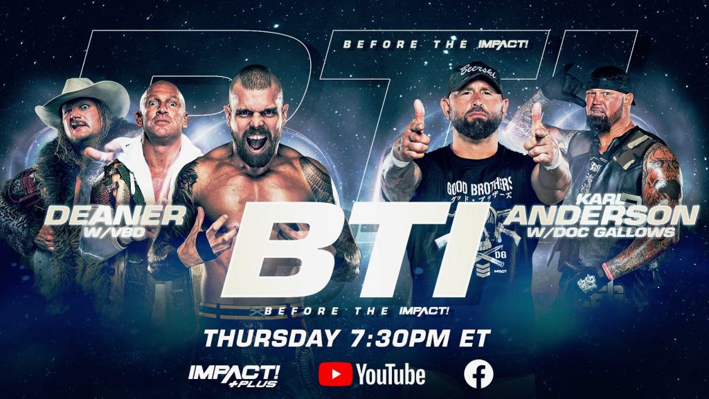 Kick off your night Before the IMPACT, streaming this Thursday at 7:30pm ET exclusively on IMPACT Plus, YouTube and Facebook. The intense rivalry between IMPACT World Tag Team Champions Violent By Design and former champions The Good Brothers rages on when Deaner takes on Karl Anderson! Plus, Gia Miller, Josh Mathews and George Iceman get you ready for all things IMPACT on the road to Rebellion.