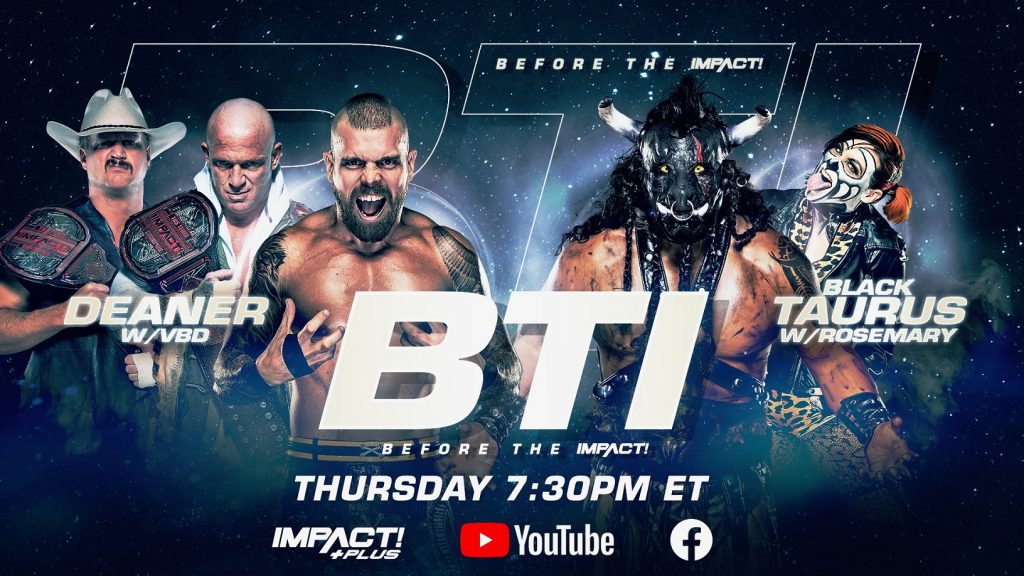 The action begins Before the IMPACT, streaming this Thursday at 7:30pm ET exclusively on IMPACT Plus, YouTube and Facebook. IMPACT World Tag Team Champion Deaner locks horns with Black Taurus in a high-stakes battle of Violent By Design vs Decay! Plus, Gia Miller, Josh Mathews and George Iceman get you ready for all things IMPACT on the road to Rebellion.
