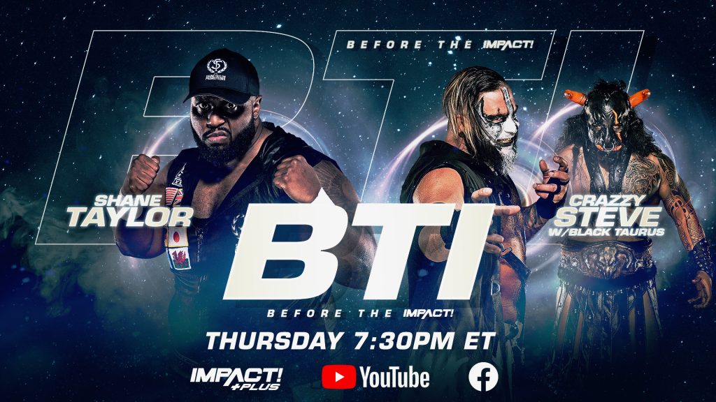 The action begins Before the IMPACT, streaming this Thursday at 7:30pm ET exclusively on IMPACT Plus, YouTube and Facebook. The daunting Shane Taylor makes his IMPACT debut as he squares off with Decay‘s Crazzy Steve! Plus, Gia Miller, Josh Mathews and George Iceman get you ready for all things IMPACT on the road to Bound For Glory.