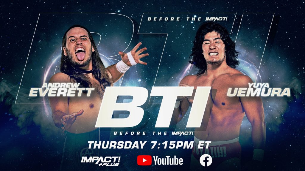 The action begins Before the IMPACT, streaming this Thursday at 7:15pm ET exclusively on IMPACT Plus, YouTube and Facebook. Andrew Everett returns to IMPACT Wrestling as he takes to the skies with NJPW up-and-comer, Yuya Uemura! Plus, Gia Miller, Josh Mathews and George Iceman get you ready for all things IMPACT.