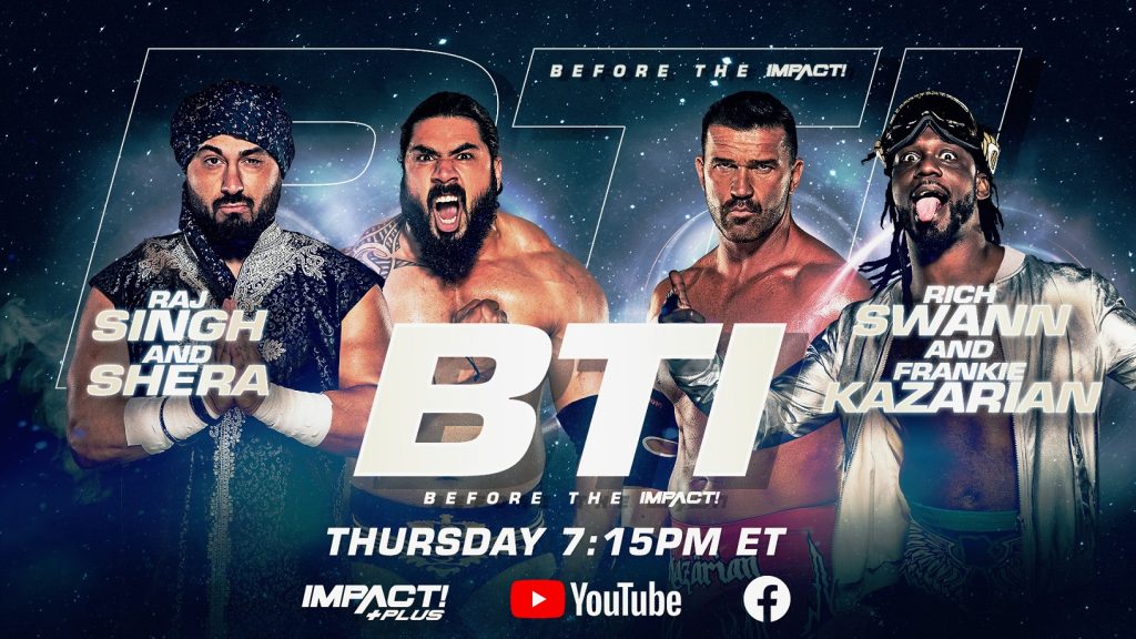 The action begins Before the IMPACT, streaming this Thursday at 7:15pm ET exclusively on IMPACT Plus, YouTube and Facebook. After his interview with Gia Miller was rudely interrupted by Raj Singh and Shera, Rich Swann joins forces with Frankie Kazarian to teach them a lesson in respect. Plus, Gia Miller, Josh Mathews and George Iceman get you ready for all things IMPACT.