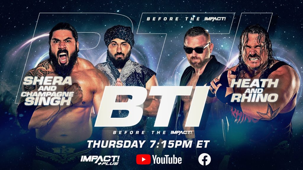 Kick off your night Before the IMPACT, streaming this Thursday at 7:15pm ET exclusively on IMPACT Plus, YouTube and Facebook. Tag teams jockey for position in the tag team division as Shera and Champagne Singh battle Heath and Rhino. Plus, Gia Miller, Josh Mathews and George Iceman get you ready for all things IMPACT.