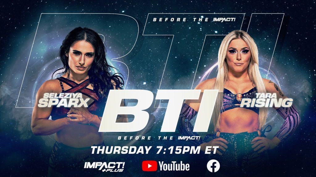 The action begins Before the IMPACT, streaming this Thursday at 7:15pm ET exclusively on YouTube, IMPACT Plus (live player) and Facebook. Knockouts take center stage as Seleziya Sparx battles Tara Rising in a match you won’t see anywhere else. Plus, Gia Miller, Josh Mathews and George Iceman get you ready for all things IMPACT.