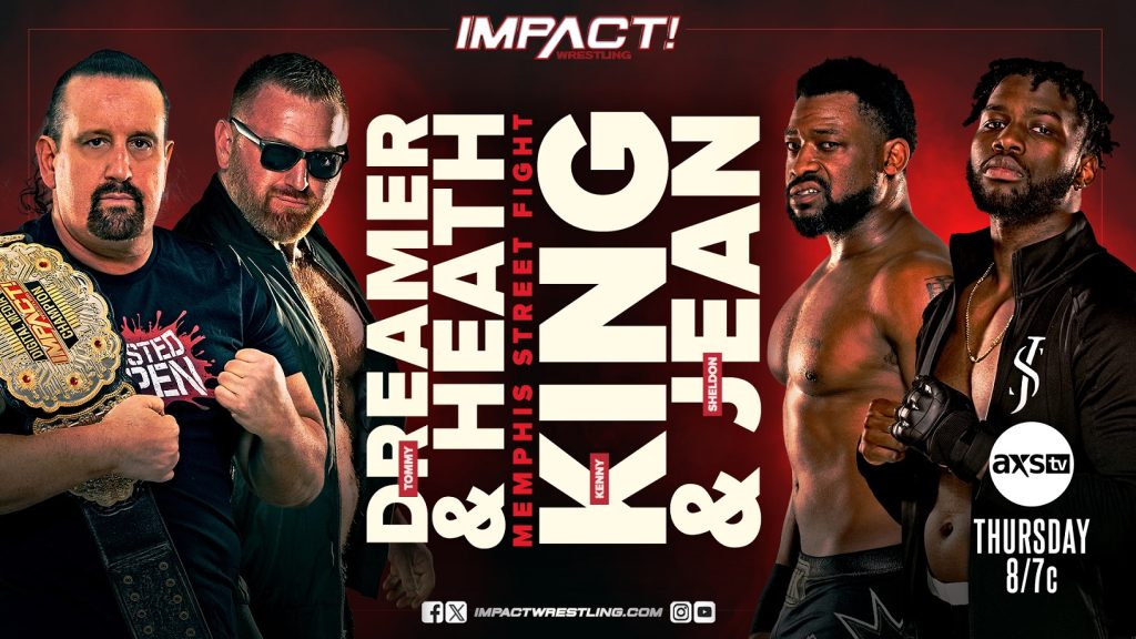 After Tommy Dreamer dethroned Kenny King as Digital Media Champion, revenge is in the air in this Memphis Street Fight! The brawl begins on the floor as Dreamer sprays beer in the eyes of King. Dreamer hits an assisted top rope elbow drop on King. King sends Heath head-first into a steel chair. King and Jean are now in control as King suplexes Heath on the outside. They place a ladder over Heath’s head, then drive him into the steel ring post. Back in the ring, King hits Dreamer with a Spinebuster into a trash can. Heath re-enters the fray, taking out Jean with a Wake-Up Call. King ties up Dreamer in a ladder, then connects with an explosive Blockbuster. King counters the Wake-Up Call from Heath as the two battle to the backstage area. Dreamer puts Jean away with a Death Valley Driver through a table for three.
