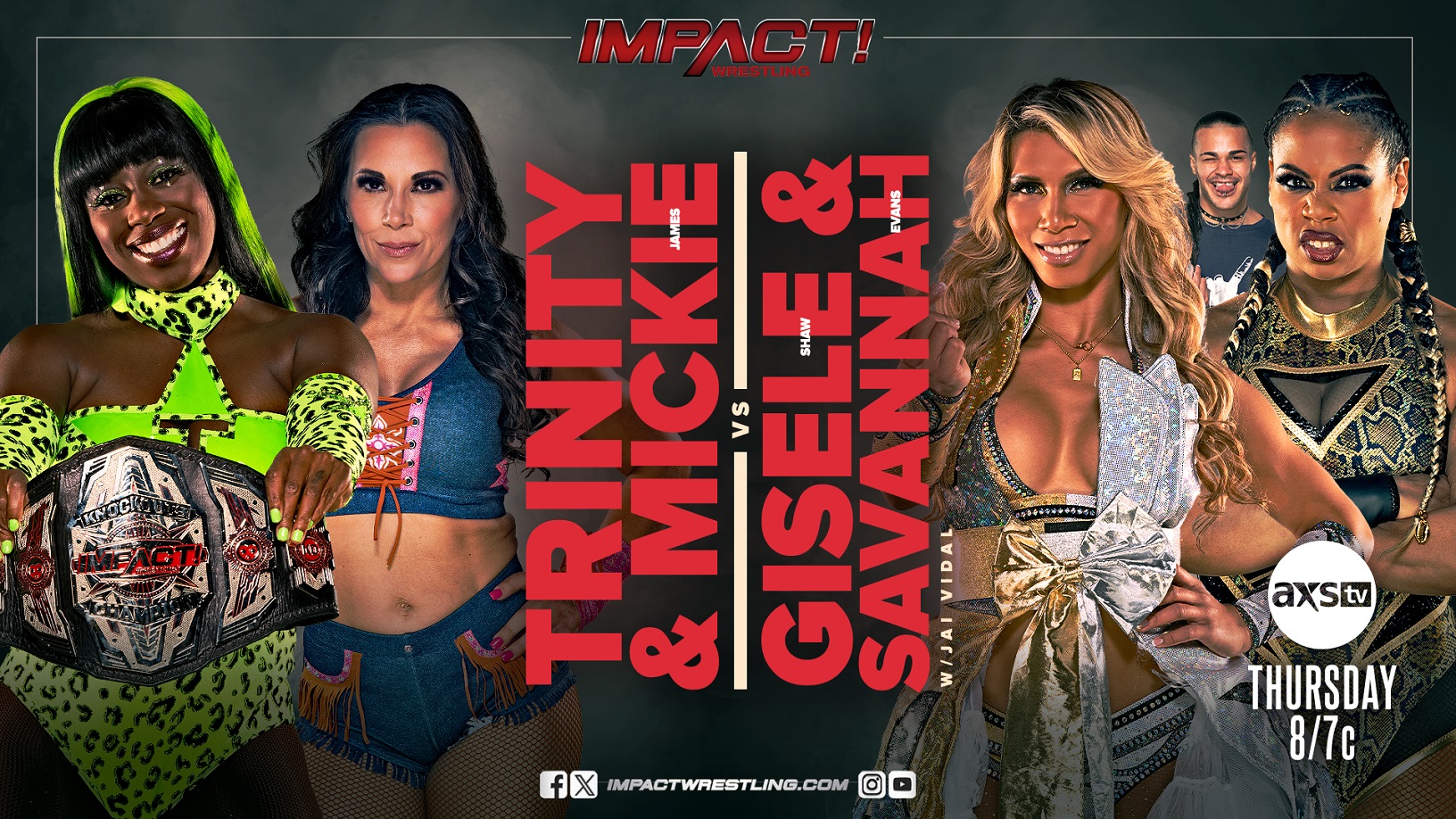 Before Trinity defends the Knockouts World Title against Mickie James in an epic first-time-ever dream match at Bound For Glory, both champion and challenger will unite for tag team action. This Thursday, Trinity and James face off against one of their fiercest rivals in IMPACT Wrestling, “The Quintessential Diva” Gisele Shaw and her bodyguard, Savannah Evans. While Trinity and James share nothing but respect for one another, will the heat of competition cause friction between them just two nights before the biggest match of their careers?