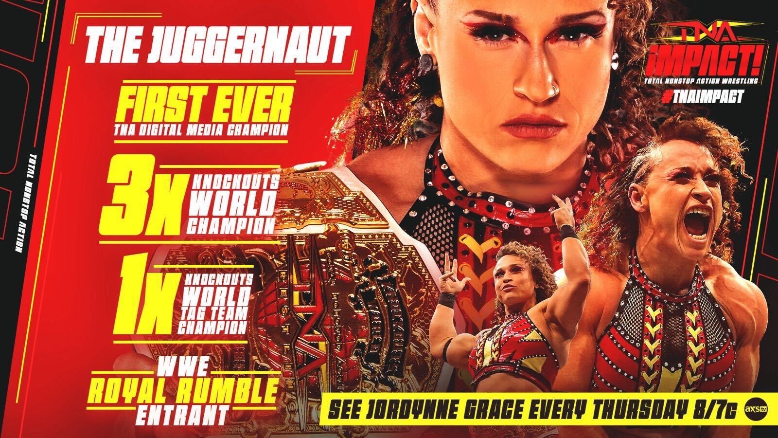 To see more of “The Juggernaut” Jordynne Grace, tune in to TNA iMPACT! Thursday nights at 8/7c on AXS TV, or see her in person at our upcoming LIVE events.