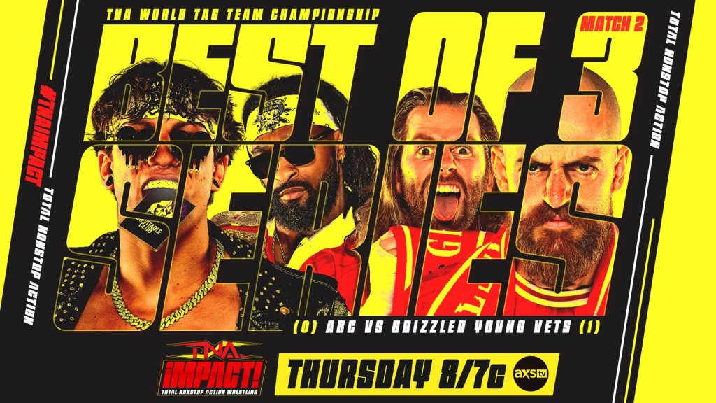 The Grizzled Young Vets defeated ABC in Match 1 of their Best of 3 Series for the TNA World Tag Team Championships – but not without bending the rules. One week later, Zack Gibson and James Drake looked to add insult to injury when they assaulted ABC backstage. This Thursday, the rival duos will face off in Match 2 and ABC’s backs are against the wall. Ace Austin and Chris Bey are in a must-win situation, otherwise they will lose the TNA World Tag Team Titles! Can ABC even the score and, at least for the time being, keep their gold intact? Or will we crown new champions on iMPACT?
