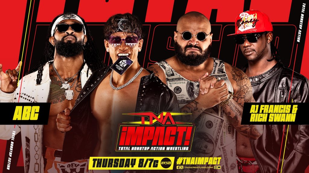 The new duo of Rich Swann and AJ Francis, now known as Fir$t Cla$$, look for success in the tag team division against former champions ABC! Francis Irish whips Swann into Ace. Ace takes down Swann with a kick between the shoulder blades, then makes the tag to Bey. Ace and Bey deliver double dropkicks to Swann. Francis is on the apron grabs Bey by the hair. The distraction allows Swann to hang up Ace on the top rope. Moments later, Francis suplexes Bey on the hardest part of the ring. Francis and Swann cut off the ring and employ quick tags to wear Ace down. Austin plants Francis with a bulldog to create separation, allowing him to tag in Bey. The pace quickens as Bey goes on the attack. Francis gets two for one as he catches and powerslams both Ace and Bey. Francis connects with the Tennessee Whisky running knee on Bey. Ace kicks Swann into a spinning neckbreaker from Bey. Swann counters the Art of Finesse into a neckbreaker of his own. Francis grabs Ace from the outside. Swann rolls him up with hold of the tights to win.