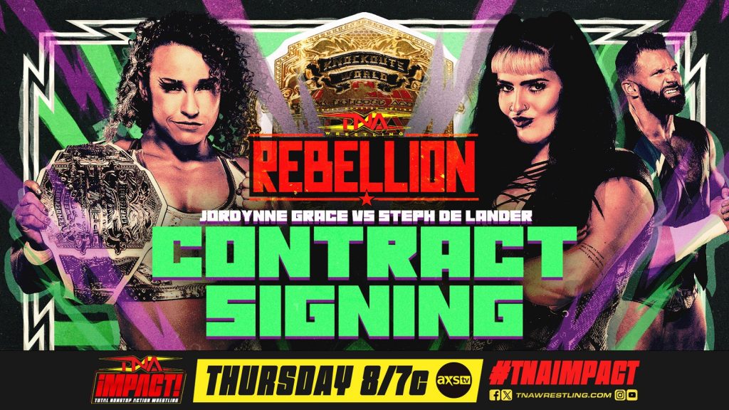 Steph De Lander is accompanied by Matt Cardona as she sits across the table from Knockouts World Champion Jordynne Grace. Director of Authority Santino Marella presides over this contract signing. Cardona demands respect from the audience at the 2300 Arena and vows that De Lander will add another championship to her list of accolades when she dethrones Grace at Rebellion. Grace says that she’s not going to roll over and let De Lander take away something that she worked so hard to capture. De Lander claims that Grace doesn’t have her head in the game after competing in both bodybuilding and the Royal Rumble. Grace says that she prides herself on outworking everyone else and will prove it when she beats De Lander at Rebellion. After all, she has beaten De Lander, her boyfriend and her boyfriend’s wife before. After the contract is signed, Grace and De Lander shake hands. Grace holds onto the handshake and Cardona’s involvement leads to the two Knockouts colliding. Marella is caught in the crossfire and goes down. Cardona blindsides Grace, allowing De Lander to Chokeslam her through the table.
