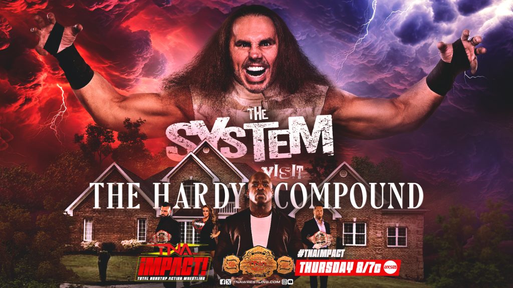 Last week on TNA iMPACT, The System decimated The Nemeth Brothers and Joe Hendry. Broken Matt Hardy then appeared on screen, summoning The System to the Hardy Compound. TNA has witnessed some of its most memorable moments at the compound. This Thursday on TNA iMPACT, The System heads to the Hardy Compound, and anything could happen!