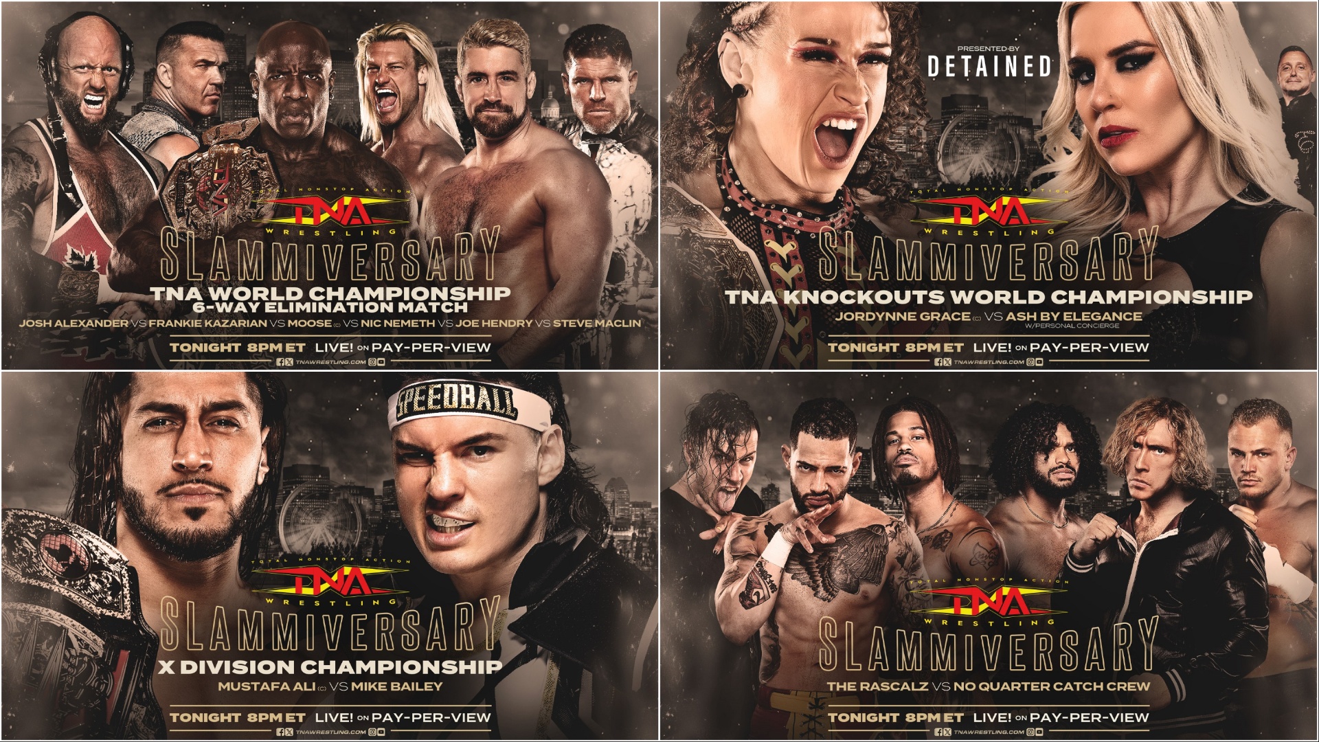 LIVE TONIGHT at 8pm ET, TNA Wrestling returns to Montreal, Quebec, Canada for the first time since 2011 with its 20th Slammiversary pay-per-view event, taking place from a SOLD OUT Verdun Auditorium!