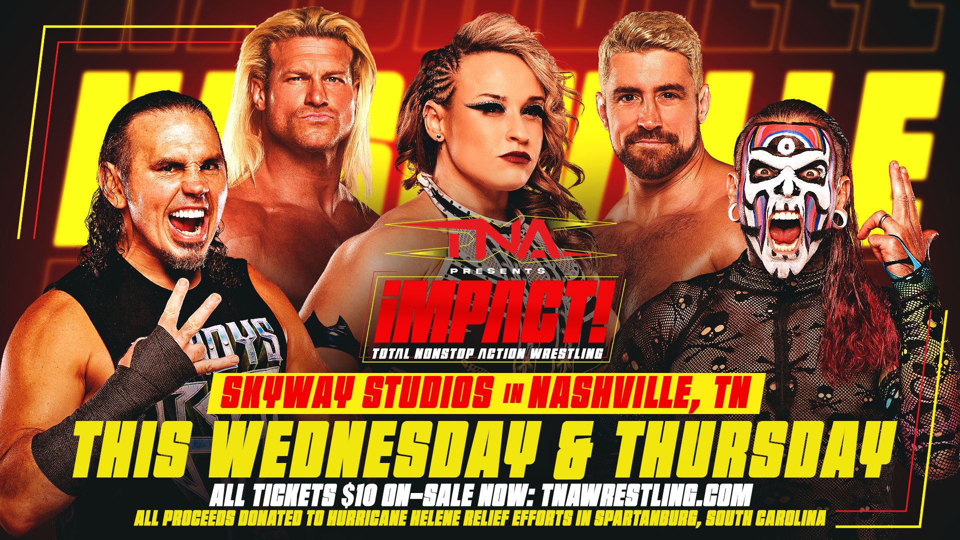 TNA will have auctions at both shows for match-used and autographed memorabilia, plus unique collectibles for sale – with ALL proceeds going to the Hurricane Helene Relief Efforts in Spartanburg.
