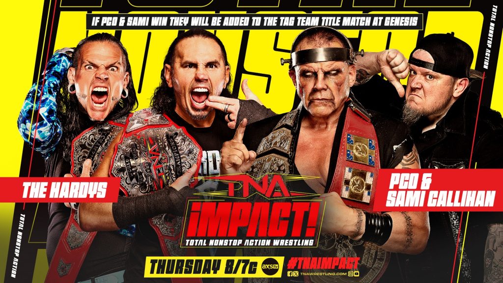At Genesis, The Hardys are set for a first time ever TNA World Tag Team Title clash with The Rascalz – but PCO and Sami Callihan are looking to insert themselves into the championship picture. Last week, Callihan campaigned for an opportunity after reminding Director of Authority Santino Marella that he and PCO have not been pinned or submitted as a duo. Now PCO and Callihan will battle The Hardys this Thursday, and if PCO and Callihan win, they will be added to the TNA World Tag Team Title match at Genesis!