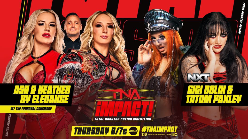 Following last week’s chaotic Championship Celebration, Santino Marella has made a huge match official: Ash & Heather By Elegance will face NXT’s Gigi Dolin & Tatum Paxley in tag team action. With Lash Legend and Jakara Jackson banned from ringside, can the Elegance duo keep their momentum, or will NXT continue to shake up the Knockouts division?