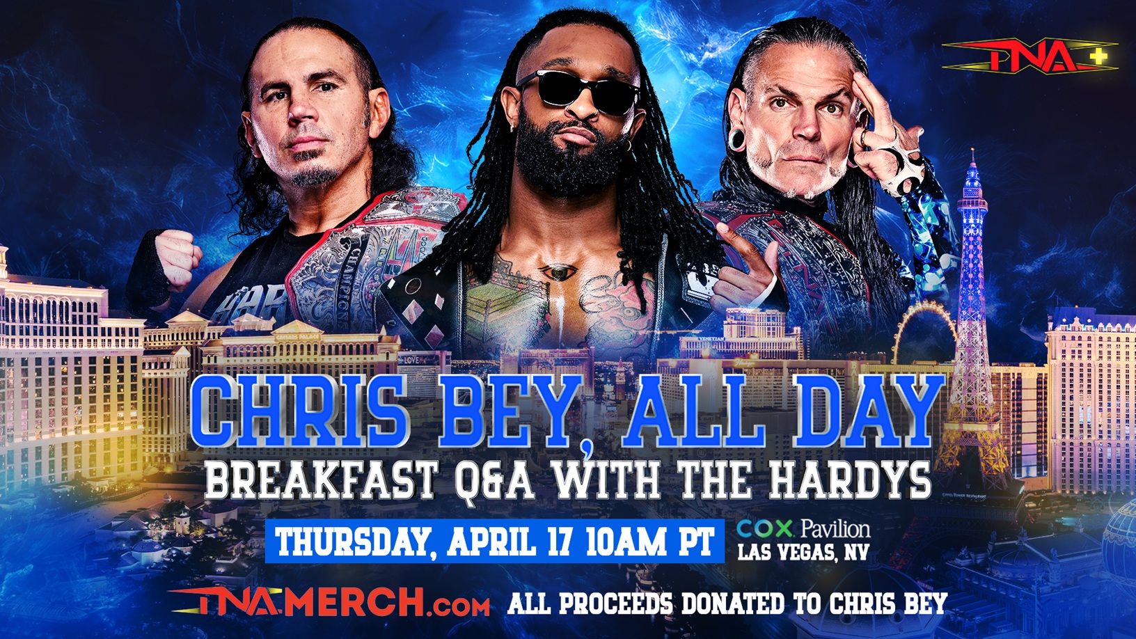 The festivities to celebrate, honor and fundraise for Chris Bey – fittingly called, “Chris Bey, All Day” – will kick off April 17 with the first-ever “Breakfast Q&A With The Hardys” at Cox Pavilion in Las Vegas, a special two-hour event starting at 10 a.m. local time. TNA announcer Tom Hannifan will host the intimate gathering for a limited number of fans, many of whom will have the opportunity to ask questions of the reigning TNA World Tag Team Champions, Jeff & Matt Hardy.