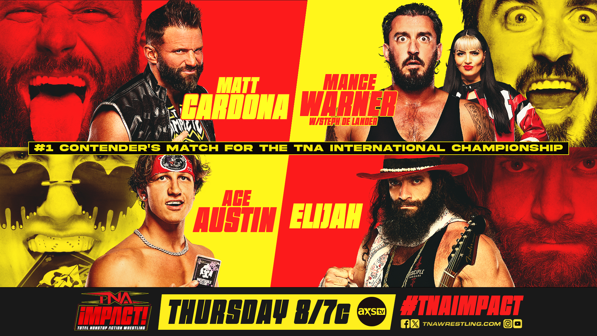 Four of TNA’s most explosive competitors, Matt Cardona, Mance Warner, Ace Austin and Elijah collide in a free for all to score an opportunity at the International Championship. Only one will earn the right to face Steve Maclin for the gold—find out who this Thursday at 8/7c on AXS TV in the US, Sportsnet+ in Canada, and TNA+ worldwide.