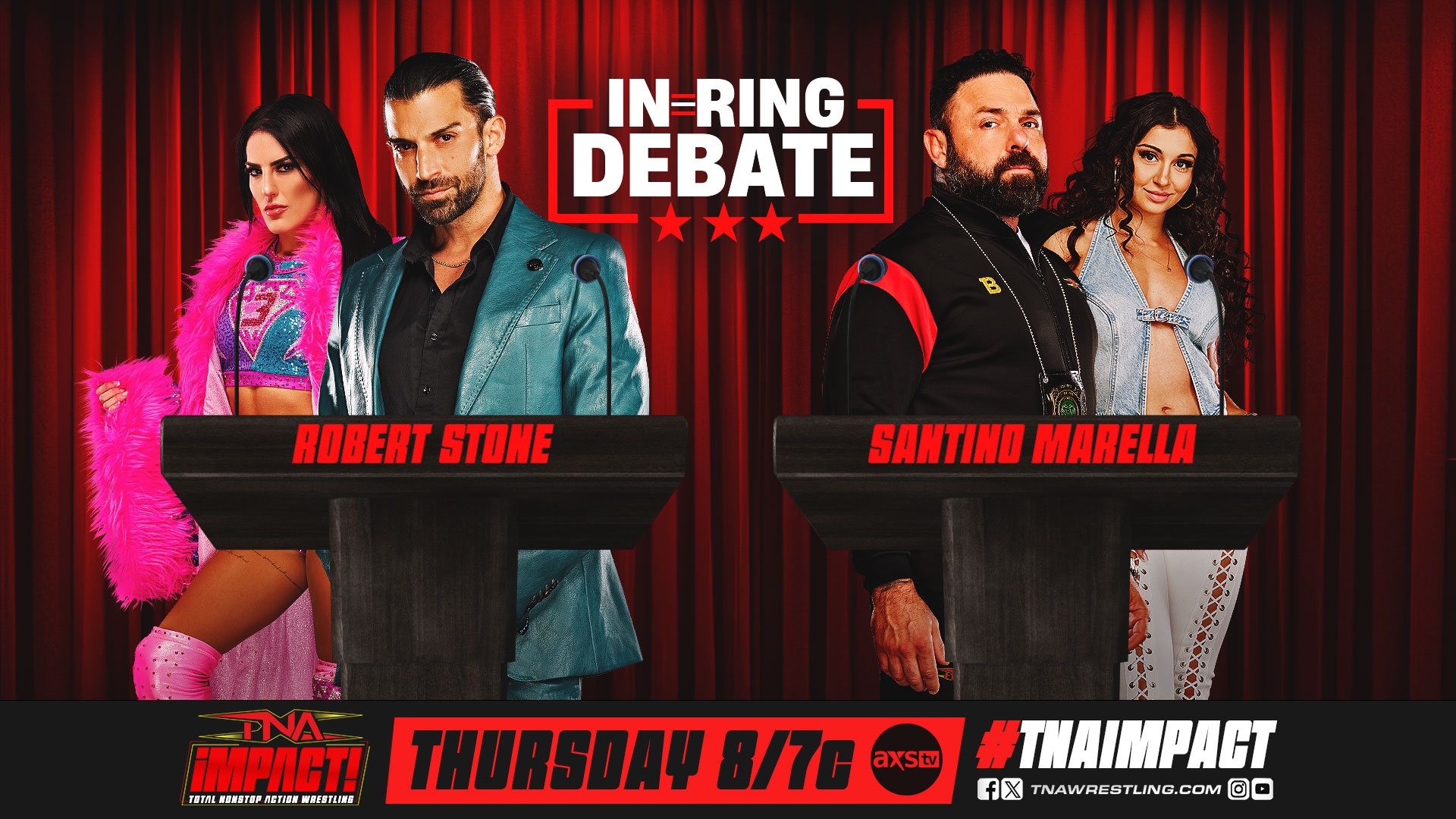 After NXT’s Robert Stone overruled Santino Marella’s call to restart last week’s Knockouts tag team match, the two will settle the score in an official in-ring debate. Tessa Blanchard will back Stone, while her Under Siege opponent Arianna Grace supports Santino Marella. Sparks are guaranteed to fly this Thursday at 8/7c on AXS TV in the US, Sportsnet 360 in Canada and TNA+ worldwide!