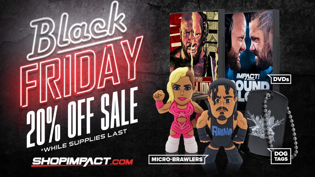 Now through this Saturday, November 26th at 9am ET, save 20% on all DVDs, Micro-Brawlers and Dog Tags during the Black Friday Sale on ShopIMPACT.com!