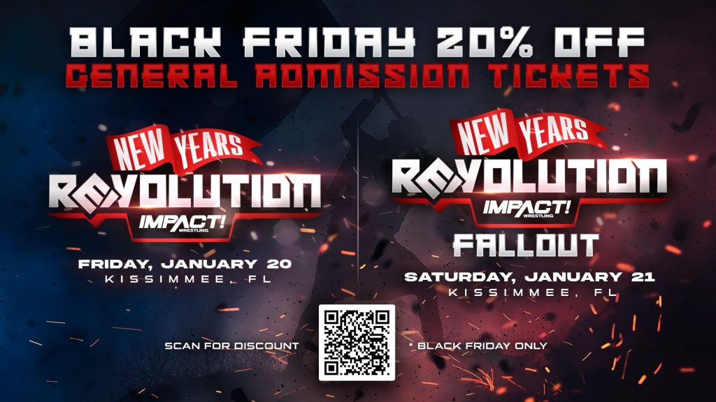 On Friday, January 20th and Saturday, January 21st, the television trucks of IMPACT! on AXS TV come to Osceola Heritage Park in Kissimmee, FL as IMPACT Wrestling presents New Years Revolution and New Years Revolution Fallout, featuring all your favorite IMPACT stars in action. Today only, take advantage of our Black Friday Sale and save 20% on General Admission tickets!